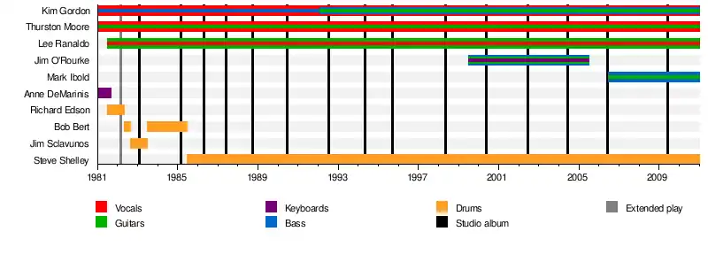 ![]() Final lineup of the band before their 2011 breakup; from left to right: Thurston Moore, Kim Gordon, Lee Ranaldo, Mark Ibold, Steve Shelley | |