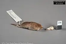 Sorex ornatus sinuosus, the Suisun shrew or Suisun ornate shrew,[2] is a subspecies of the ornate shrew that occurs in the tidal marshes of the northern shores of San Pablo and Suisun bays (northern arms of the San Francisco Bay, as far east as Grizzly Island and as far west as the mouth of Sonoma Creek in the vicinity of Tubbs Island).[3][4][5] Brown and Rudd redefined the western boundary of the range from a prior designation of the Petaluma River. The Suisun shrew has been designated as a Species of Concern by the U.S. government and a Mammalian Species of Special Concern by the state of California.