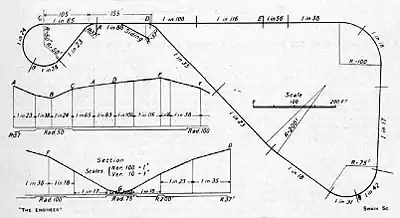 In 1917, General Manager Hoy authorised a trial of the system and a test circuit was laid on the veld at Canada Junction, 9 miles (14 kilometres) from Johannesburg. The dog-bone test circuit was 742 yards (678 metres) around, laid with light 16 pounds per yard (8 kilograms per metre) rails on 7 pounds (3 kilograms) steel sleepers and hook bolts. The track included tight curves of as low as 37 feet (11 metres) radius and steep gradients of as much as 1 in 17 (5.88%).[1]