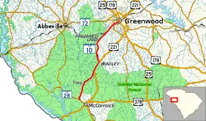SC 10 is a 22.7 miles (36.5 km) two-lane, minor state highway in the southwest portion of the Upstate of South Carolina. The route runs generally south to north. Most of the route (particularly the southern portion) runs through or alongside the Sumter National Forest. The route begins just northwest of McCormick heading north to where is it begins a brief concurrency with US 221. The route continues on northward to Greenwood, where it enters the city's southwest side, ending at the US 25 Bus./US 178 Bus./SC 34 concurrency.[3]