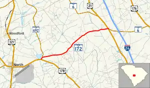 SC 172 begins at an intersection with U.S. Route 178 (US 178; North Road) east-northeast of North, within Orangeburg County. It travels to the north-northeast. Approximately 1,000 feet (300 m) later, it meets the eastern terminus of SC 692, with SC 172 heading to the east-northeast before it enters Calhoun County. It passes by the Do-Little Field airport just before it meets US 21 (Columbia Road). SC 172 continues another 0.09 miles (0.14 km) to end at SC 6 (Caw Caw Road).[3]