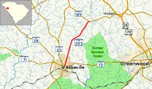 South Carolina Highway 203 (SC 203) is a 7.750-mile-long (12.472 km) state highway in the U.S. state of South Carolina. The highway connects Abbeville and rural areas of Abbeville County.