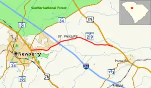 South Carolina Highway 219 (SC 219) is a 9.030-mile-long (14.532 km) highway in the U.S. state of South Carolina. The highway is designated on an east–west direction, from SC 34 in Newberry to U.S. Route 176 (US 176).