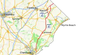 South Carolina Highway 41 (SC 41) is a 121.5-mile (195.5 km) state highway, connecting the Charleston region with eastern portions of the Pee Dee region in South Carolina. It serves as an alternative route to U.S. Route 52.