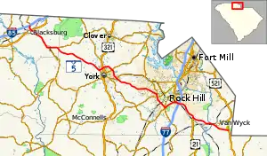 South Carolina Highway 5 (SC 5) is a 51.719-mile (83.234 km) primary state highway in the U.S. state of South Carolina. The highway, signed as north–south, travels in a northwest–southeast direction connecting the cities of Rock Hill, York and Blacksburg.