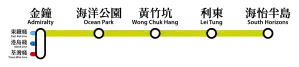 The South Island line (Chinese: 南港島綫), identified by light green on the MTR route map, is a rapid transit line of Hong Kong's MTR metro system. This line connects the HK business district from Admiralty station to the Southern District of Hong Kong Island and the island of Ap Lei Chau, which was not served by any rail transport prior to the opening of this line.[2] The rolling stock of South Island line is purpose-built for driverless operation. Trains are remotely controlled from the Operations Control Centre in Tsing Yi. Approved by the Executive Council in 2007,[3] the line commenced service on 28 December 2016.[4]