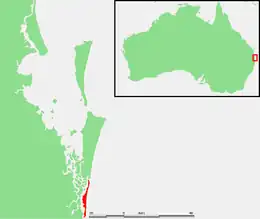 South Stradbroke Island (Indigenous: Minjerribah[2]), colloquially South Straddie,[3] is an island that lies within Moreton Bay in the Australian state of Queensland, south of Brisbane and forms the northern end of Gold Coast. The island is a locality within the City of Gold Coast.[4] In the 2021 census, South Stradbroke had a population of 142 people.[5][1]
