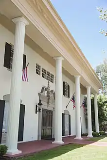 In 1936, the actor Bing Crosby built a Southern Colonial home in a four-acre walnut grove in Toluca Lake in the San Fernando Valley region of the city of Los Angeles, California. It was described by noted Architectural Digest writer Steve Vaught as "reminiscent of the great Southern plantations from that civilization gone with the wind, although in many respects it resembled George Washington's Mount Vernon estate. As with Mount Vernon, the Crosby home was graced by a sweeping colonnade running the entire length of the front facade." The house was virtually destroyed by fire due to faulty Christmas tree lights in 1943, but was later restored by subsequent owners. The original house had 6 columns across the entire front of the house, but subsequent renovations contain only four columns.