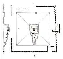 The complex is surrounded by a wavy wall, which incorporate the remains of the chapel in the middle of the east side; it consists of a large central chamber with two chambers on each side of the storehouse. The central chamber was attached in its southwestern corner with a sacrificial hall with a vaulted roof.