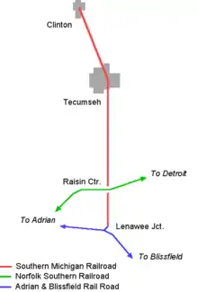 The railroad runs 13.5 miles (21.7 km) from Clinton, Michigan, through Tecumseh, Michigan, to Lenawee Junction, Michigan. This line is the second railroad constructed in the State of Michigan, and the first branch line. It was originally the Palmyra and Jacksonburgh Railroad, running between Palmyra (near Lenawee Junction) and Jackson, Michigan.
