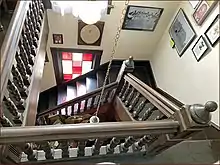 Staircase balustrade of the Southgate–Lewis House in June 2021 University of Texas at Austin[6] "One of the finest staircases in all of Austin".[5] Note that the W. H. Passon Society has exhibits displayed upon the walls of the stairway.