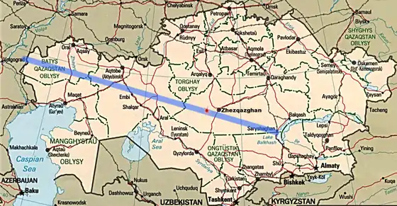 This map of Kazakhstan shows the missile flight path (in blue) for the K Project warhead-carrying missiles.[4] The nuclear missiles were launched from the Kapustin Yar site east of Volgograd (formerly Stalingrad) in the upper left part of the map. The red burst in the flight path west of Zhezqazghan is the detonation location of the K-3 nuclear test (Test 184). The detonation locations for the other tests have not been publicized, but from the published detonation altitudes and basic physics, it is known that the other K Project nuclear detonation locations were along the designated flight path between the K-3 detonation site and Saryshagan (at the eastern end of the designated flight path). The instrumented telephone line damaged in the K-3 test went from Zhezqazghan through Qaraghandy (Karaganda), northward to Aqmola (now called Astana, the capital of Kazakhstan) and ended at an unknown location just north of Aqmola.[2]