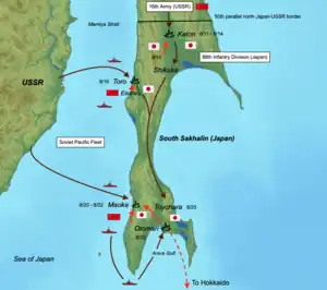 The Soviet invasion of South Sakhalin, also known as the Battle of Sakhalin (Russian: Южно-Сахалинская операция; Japanese: 樺太の戦い), was the Soviet invasion of the Japanese portion of Sakhalin Island known as Karafuto Prefecture. The invasion was part of the Soviet–Japanese War,[3] a minor campaign in the Asian Theatre during Second World War.