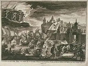 A few days after, the fleet was obliged, due to contrary winds, to take cover near the Cape Palos, but on the 24 June, after overcoming its difficulties, it continued its journey towards Oran.[18] On 27 June, the fleet arrived at the coasts of Oran, and the Duke of Montemar, ordered the troops to disembark on the Aguadas beach, near Mers el-Kebir, but this could not take place till the next day.[18] At dawn, the troops began to disembarked with barely any resistance.[18] The Algerian troops, who up to that time had remained in defensive positions, began to attack the Spanish troops; however, the firepower of the Spanish ships,[18] in particular the ship of the line Castilla, under the command of Don Juan José Navarro,[19] made a big contribution in covering the landing troops by the use of his naval guns, decimating and forcing the Muslim troops to flee.[19] Before midday, all the infantry had disembarked, and the cavalry followed soon after.[3]