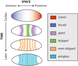 Consider the gene wingless, a member of the wnt family of genes. In the early embryonic development of the model organism Drosophila melanogaster, or fruit fly, wingless is expressed across almost the entire embryo in alternating stripes three cells separated. This pattern is lost by the time the organism develops into a larva, but wingless is still expressed in a variety of tissues such as the wing imaginal discs, patches of tissue that will develop into the adult wings. The spatiotemporal pattern of wingless gene expression is determined by a network of regulatory interactions consisting of the effects of many different genes such as even-skipped and Krüppel.