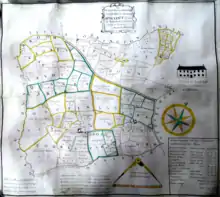 In 1737 Speccot was purchased from the Rolles by their relatives the Stevens family of Cross, Little Torrington. Henry Stevens (1689-1748), described in his will as "of Smithcott" in the parish of Frithelstock, but who built the existing mansion of Cross between 1744 and 1748,[26] married Christiana Maria Rolle (1710-1780), a daughter of John Rolle (1679-1730), MP, of Stevenstone, in the nearby parish of St Giles in the Wood, and sister of Henry Rolle, 1st Baron Rolle (1708-1750). Portraits of Christiana and of her brothers John Rolle Walter (1712-1779), and Denys Rolle (d.1797), successively owners of the Stevenstone estates, were painted by Thomas Hudson and were given in the early 1900s by Lord Clinton to the Great Torrington Town Lands and Poors Charity. They are on public display in Great Torrington townhall. A "beautifully drawn map" was made of Speccot in 1765 by Malachy Hitchins (1741–1809) for its then owner Richard Stevens of Winscott, Peters Marland.[25] Richard II Stevens (1702-1776) of Winscott, was MP for the Rolle family's pocket borough of Callington in Cornwall between 1761 and 1768. His mural monument exists in Peters Marland Church. He was one of the two sons of Richard I Stevens by his wife Elizabeth, and his brother was Henry Stevens (1689-1748) of Cross, in the parish of Little Torrington. Richard II Stevens (d.1776) married Elizabeth (1707-1760), of unknown family, by whom he had three sons who pre-deceased him without progeny and two daughters who were also without progeny. His daughter Elizabeth Stevens (1727-1792) married firstly Robert Awse of Horwood House in the parish of Frithelstock, and secondly John II Clevland (1734-1817), seven times MP for Barnstaple, of Tapeley near Bideford. Winscott passed after Cleveland's death to the descendants of Richard's elder brother, Henry Stevens (d.1748), of Cross, thus re-uniting the three Stevens estates.