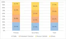 Particular schools differ from both public and private schools in the way they are funded and run. While privately run, particular schools are not altogether outside the control of the Dutch Ministry of Education, as they are subsidized on equal footing with public schools, and cannot charge tuition over the statutory rate.[3] They are therefore also distinct from private schools—of which there are a small but increasing number in the country[4]—which get no subsidies and can charge market tuition.