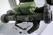The short range version of the weapon was unveiled in 2012 to give infantrymen a guided missile between the larger Spike-MR and unguided rockets.[13] The missile is 8 kg (18 lb) for a 9.8 kg (22 lb) disposable munition for use at platoon-level whose minimum range is 50 m (160 ft) and whose maximum range is 1.5 km (0.93 mi). It is equipped with a stiff-necked uncooled electro-optical infrared seeker and advanced tracker, as opposed to the gimballed seeker in the Spike MR/LR/ER versions.[14] The Spike-SR does not require a separate sight, instead utilizing the low-cost thermal camera and guidance electronics strapped to the missile's nose to provide this function through a display integrated into the launcher, showing the target until launch.[15] The warhead can either be a multi-purpose tandem shaped-charge warhead with blast-fragmentation effect[13] or a new Penetration-Blast-Fragmentation (PBF) variant leveraged from the MATADOR's anti-structure warhead to equip maneuvering forces in urban environments to breach enemy cover and structures with a lethal blast effect.[14] In May 2016 Rafael concluded deliveries of Spike-SR to its first export customer,[16] later revealed to be the Singapore Armed Forces to replace the Carl Gustaf M2.[17]