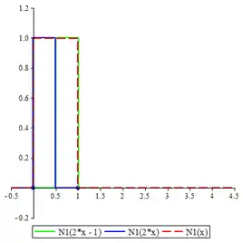 The cardinal B-splines are defined recursively starting from the B-spline of order 1, namely , which takes the value 1 in the interval [0, 1) and 0 elsewhere. Computer algebra systems may have to be employed to obtain concrete expressions for higher order cardinal B-splines. The concrete expressions for cardinal B-splines of all orders up to 6 are given below. The graphs of cardinal B-splines of orders up to 4 are also exhibited. In the images, the graphs of the terms contributing to the corresponding two-scale relations are also shown. The two dots in each image indicate the extremities of the interval supporting the B-spline.