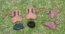 Brushing boots or splint boots are used to protect a horse's legs during exercise, protecting the lower leg from injury that may occur if one leg or hoof strikes the opposite leg. They are commonly seen on horses in fast work, such as jumping, when in training, such as when longeing, or in competitions such as reining or eventing. Brushing injuries are more common on the forelegs, when one hoof catches the other leg, or when the fetlock or cannon bones hit each other. This can cause a serious injury on a horse's legs, especially if the horse is wearing shoes.[1] Poor equine conformation can often lead to brushing, although even properly-conformed horses can also accidentally injure themselves. Brushing boots may also be placed on horses in the field to protect them if they get overly excited. Other reasons for use may include placement on a young or unfit horse which may be excitable and step on itself, or on horses subject to intense work that may stumble more if they are tired.