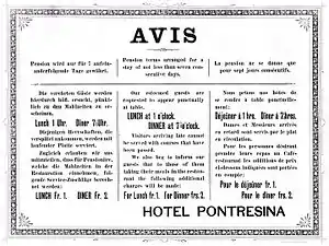 Further innovations designed to build a winter season business included a programme of dances and costume balls arranged by the larger hotels, including the Hotel Pontresina, advertised both to their own guests and to guests of other Pontresina hotels.[20] In January 1913 one of the balls was held as a celebration of the German Kaiser's birthday.[21] Something of an experiment, in the view of at least one contemporary reporter, was the introduction of the "Tango Tea party" at the Hotel Pontresina on 27 December 1913.[22]