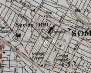 Spring Hill is the name of a ridge in the central part of the city of Somerville, Massachusetts, and the residential neighborhood that sits atop it. It runs northwest to southeast, roughly bounded by Highland Avenue, Somerville Avenue, Elm Street, and Willow Avenue. Summer Street runs along the hill's crest.