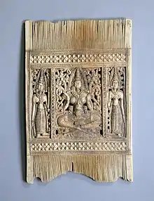 Sri Lankan ivory carving industry began in the 1st century BC.[1] King Jetthatissa of the Anuradhapura Kingdom has patronised the ivory industry.[2] Most of the surviving ivory works are attributed to Kandyan Kingdom. Sri Lankan ivory industry began during the Anuradhapura period. The oldest surviving ivory piece ever found in Sri Lanka is the image of a woman wearing a pearl girdle found from the southern vāhalkada of Ruwanweli stupa.[1] Ancient chronicle Mahavamsa mentions that King Parakramabahu the Great of Polonnaruwa had built a garden with decorative ivory railings.[3]