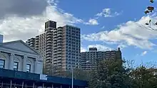 There are also several apartment buildings in St. George. The Ambassador Apartments, built in 1932 in the Art Deco style, is located at 30 Daniel Low Terrace.[129][130] The 20-story Castleton Park Apartments, at 165-185 St. Marks Place, are estimated to be the tallest buildings on Staten Island.[131]