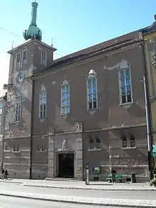 Saint Mark's Church is a triple-nave long church (Norwegian: langkirke) two stories high with facades made of suspended brick. The church is one of the few churches in Oslo built into a dense block of apartment buildings on both sides. The construction lot was a rock outcropping when the church was built,[2] and therefore there is a staircase up from street level on Ullevål Street. The main entrance is from Schwensen Street.[3]