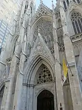 The cathedral's masonry was laid during summer as the stonework could not be laid in the cold.[50] By late 1870, the marble walls had been built to a height of 54 feet (16 m) and the transept was finished.[50][62] The entrance on Fifth Avenue, measuring 70 feet (21 m) tall, had also been finished.[62] Over a hundred workers were busy quarrying marble from Pleasantville, north of New York City. The marble was transported down to New York City via the Harlem Railroad, where a branch track led to the new cathedral's site.[50] The construction of the new cathedral drew relatively little interest for New York City's non-Catholic population,[63] though several commentators praised the cathedral's design.[31] An anonymous author for the Real Estate Record and Guide wrote that the new St. Patrick's Cathedral was the "most gorgeous ecclesiastical edifice on this continent", though the critics perceived the buttresses on the north and south sides of the facade as "altogether unnecessary".[64] A reporter for the New York World, probably Montgomery Schuyler, wrote in 1871 that the cathedral would be "one of the leading ecclesiastical structures in the world".[31]