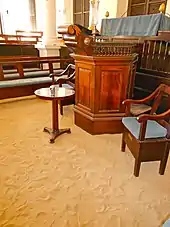 The St. Thomas Synagogue stands north of Charlotte Amalie's central business district, on the north side of Crystal Gade near its junction with Raadets Gade. It is a single-story structure, built out of rubblestone joined by a mortar mix of lime, sand, and molasses, and covered by a shallow pitch hip roof. Its front, separated from the street by an entry courtyard, has a Greek Revival temple front, but with Gothic Revival arched window openings. The façade is recessed, with the temple pediment supported by brick pillars with Tuscan styling. On the interior, the Torah ark is located on the east wall, with the tevah, on a dais against the west wall. The center of the chamber is demarcated by a square of four Ionic columns mounted on pedestals, and there are rows of bench pews on the north and south walls. The seating areas of men and women are separated by movable wooden partitions.[3]