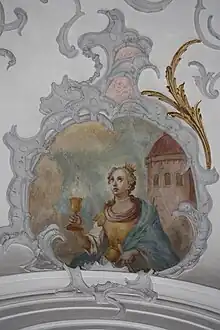 Ignaz Waibel created the sculpture of the Good Shepherd around 1700, which is placed in the choir room[15] opposite the 18th century figure of St. Nepomuk. In the rear part of the nave, on one side, there is a sculpture of St. Odile, made around 1500, which used to be in the small Gothic chapel of St. Ottilie on the outskirts of the village, and on the other, a statue of St. Anthony of Padua.
