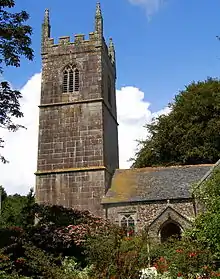 The parish church is dedicated to St Anthony and is close to the shore. It is medieval though parts are of other dates: a window in the chancel (Early English) is the earliest and the north aisle with an arcade of plain octagonal piers somewhat later. The tower was built in the 15th century of granite blocks at the west end. The font is ornamented with angels and a Latin inscription and is probably of the 15th century.[5]