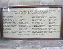 A glacial boulder by the path to the lych-gate marks the meeting point of three of the 15 townships in the parish, Berriew, Cil and Faenor Issa (Lower Vaynor). The lych-gate was erected as a memorial to those who fell in the Great War 1914–1918. The names of those who fell in the Second World War 1939–1945 were added later.[9] This is presumably the War Memorial of 1933 by Ninian Comper.[10] The lychgate is in the same position as the one shown in the 1800 print by William Parslow.