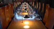 St Catherine's has a number of lecture theatres and seminar rooms, a music house, two student computer rooms, a small gym, squash courts, a punt house, a Grade I listed bike shed[29] and among the most spacious common rooms in Oxford. There are also additional purpose-built conference facilities with lecture theatres, meeting rooms and bar, music room, and car parking available for non-students. The dining hall, which seats 350 diners, has the largest capacity of any Oxford college.[30]