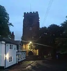 The church is built of red sandstone ashlar with a lead roof.[1] Its plan consists of a tower at the west end, a nave with aisles, a chancel, a vestry to the northeast, and a southeast porch. At the east end of each aisle is a chapel.[6] The porch has two storeys, the upper projecting over the lower one.[3] Most of the church is in Perpendicular style although the east window is Decorated.[7]