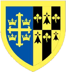 Azure a Cross flory between four Ancient Crowns impaling Per fess Sable and Or a Pale counterchanged in the Or an Ermine Spot Sable and in the Sable a Trefoil slipped Or the whole within a Bordure also Or.