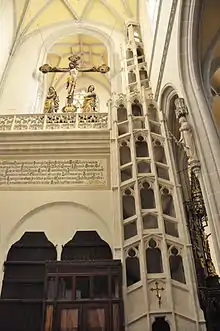 This addition was unconventionally situated in the middle of the main nave length, and a unique central hall space was created. The portal decorations of the main nave and side aisles were inspired by Gothic buildings in Prague and Kraków, and were included in the second construction stage. The influence of Parler's masonry at Saint Vitus Cathedral of Prague became evident in the King's Oratory and its spiral staircase, as well as in a motif of round banisters of the oratory and a stone gallery over the sacristy.