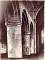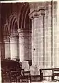 While the external fabric of the church is largely Early English in style due to the Victorian restorations, much of the interior consists of Norman material.[12] This is present in the nave, the crossing, the first bay of the chancel, the arch to the Lady Chapel and in the remains of the choir chapels.[14] Richards considers that it is the best masonry of the Norman period in Cheshire.[1] Inside the church are many early effigies which are all damaged, some dating back as far as the late 13th or early 14th century.[1][2] Monuments to the Warburton family are in the Lady Chapel. In the church are two fonts, one dating from the 15th century, the other from the Commonwealth period. Two brass chandeliers are dated 1722.[1] The pulpit is from the 19th century. The reredos, dated 1876, is by John Douglas and was made by Morris & Co.; it includes a painting of the Last Supper.[2] The organ had been built as a temporary organ for the coronation of Queen Victoria in 1838 by William Hill and Company of London. It was then rebuilt for St John's, transported to Chester by barge and installed at the west end of the church. It was opened on 28 October 1838 with the opening recital given by Henry Gauntlett as he could actually play the pedals. In the 1859–66 restoration it was moved to the south transept and in 1895–96 it was moved to the north transept, when the organ was put in its current case. In the 1960s it was converted to electro-pneumatic action by Charles Whiteley and Company. In 2002 it was restored by Rod Billingsley following vandalism.[15] The organ case dated 1895 is by Thomas M. Lockwood. A memorial to Lockwood is in the north aisle. The stained glass in the east window dated 1863 was designed by T. M. Penson and made by Clayton and Bell. The west window was designed by Edward Frampton and is dated 1887–1890. In the north aisle is a barely visible wall painting of St John the Baptist.[14] The church contains nine memorial boards by members of the Randle Holme family.[16] Also inside the church are fragments of late Saxon stone crosses that are thought to have been originally in the churchyard.[17] The parish registers begin in 1559.[1]