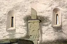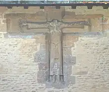 The porch includes two Anglo-Saxon stone rood reliefs, but they are repositioned and their original sites are not known. The one on the east wall of the porch is 8th century[7] and has lost its head.[8] The one on the south gable of the porch is 10th century[9] and has been assembled with Christ's left and right arms swapped over and the figures of Saint Mary and Saint John the Evangelist also transposed.[6]