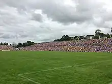 The ground is named after Saint Tiarnach (Tigearnach, d. AD 548), who founded Clones as a monastic settlement c. AD 500.[2] The Ulster Final was held in Clones from 1905 until 2004. Prior to this, a mixture of grounds were used as venues for the Ulster final. Between 2004 and 2006, due to increased capacity, the Ulster Final was played at Croke Park in Dublin.[3][4] However, with the 2007 Leinster Senior Football Championship final being scheduled for the same date, that year's Ulster Final was restored to Clones, with Tyrone narrowly defeating Monaghan by a scoreline of 1–15 to 1–13.[5] The Ulster Final has been held in Clones every year since 2007. The capacity of St Tiernach’s Park capacity was originally 36,500 spectators, but that was reduced in 2019 following a health and safety review.[1] 2019 marked the 75th anniversary of St Tiernach's Park.