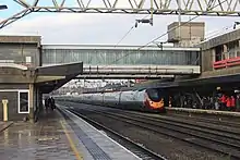 There are five platforms in use at the station, all of which are accessible from either of the main lines that converge from the south.[9] Platform 1 is usually used for services to London Euston and platform 3 for Avanti northbound services via Crewe from the Trent Valley Line. Platform 4 is usually used for trains towards Birmingham New Street and the West of England. Platform 5 is usually used for CrossCountry services towards Manchester, London Northwestern Railway services towards Liverpool Lime Street and Avanti services to Preston extending to Blackpool or Scotland. Finally, platform 6 is usually used for trains starting/terminating towards/from London Euston, Birmingham New Street, Northampton, Stoke-on-Trent, Crewe and Liverpool Lime Street.[10]