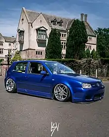A Mark 4 R32 Golf displaying the "stanced" look with aftermarket air suspension and Blitz03 & Work VSKF Wheels with negative camber.