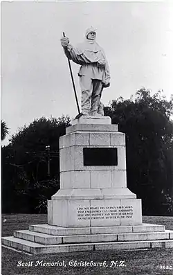 The explorer Scott had used Christchurch and Lyttelton as his New Zealand base for the British National Antarctic Expedition, 1901–1904 and Terra Nova Expedition, 1910–1913. In between, Ernest Shackleton's Nimrod Expedition also used Lyttelton as the base for their attempt to reach the South Pole, but they failed to get there. The objective of the Terra Nova Expedition was to be the first to reach the geographical South Pole. Scott and four companions reached the pole on 17 January 1912, to find that a Norwegian team led by Roald Amundsen had preceded them by 33 days. Scott's entire party died on the return journey from the pole.[2][3] Their deaths resulted in them being treated as heroes throughout the British Empire.[4]
