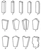 Standing stećaks are mostly cut in the form of columns. This form is very similar to the oldest Muslim nišans without turbans, on which appearance stećaks in the form of columns had a certain influence.[6] Columns are nothing more than upright slabs or upright chests. In order for them to stand firmly, they had to be partially buried or dug in, or in local tongue "usaditi" (transl."planted" – transl."rooted"), into the ground which is why they are most often called "usađenik". Thus, some columns end with a flat top surface, some as a roof with two or three sides. There are columns that end in a protruding, rounded, barrel-shaped way, as well as those that are arched in that part, lying down. Quite a number of upright slabs are carved so that they gradually widen from the bottom upwards. And such surfaces have very different finishes. Quite rare examples of columns that look like upright gables have also been found. Amorphous or loosely carved upright stećaks similar to columns have been recorded. The number of columns is about 4% of the total stećak. The fact that the columns are mostly studded in Serbia and eastern Bosnia, and that there are few of them in central Bosnia, and that in western Bosnia, Herzegovina, Montenegro and Croatia they are a very rare or almost completely exceptional phenomenon, clearly shows where this influence, due to the Turkish-Ottoman presence, first reflected. Stećci columns are considered to be a phenomenon of the second half of the 15th and the entire 16th century.