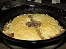 Some versions are full, or "double-crust", pies, in which the cooking dish is lined with pastry before the meat mixture is added, after which a pastry top is put over it.[20] In other versions the meat is put straight into the dish, with only a pastry lid.[21] In either case, a pie funnel is often used to stop the top crust sinking into the meat mixture during baking.[22] Some recipes call for puff pastry; others for shortcrust.[21] In some the meat is cooked before going into the pie;[23] in others it goes in raw.[1] In addition to the steak and kidney, the filling typically contains carrots and onions, and is cooked in one or more of beef stock, red wine and stout.[24]