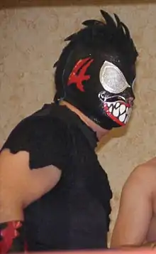 Storm's and Quackenbush's first match against each other on July 13 originally ended in Quackenbush's submission victory, but in the end the decision was reversed, when he refused to release the Chikara Special on Storm.[36] When everyone else turned on Storm, brand new Young Lions Cup Champion Vin Gerard, who had wrestled as Equinox prior to his unmasking at the hands of Hero and who had also been thrown out of the Chikara locker room, when it was revealed upon his unmasking that he was no luchador, came to Storm and suggested an alliance between the two outcasts.[35] On August 9 Storm defeated Quackenbush in a rematch, after Gerard interfered in the match and hit Quackenbush with a low blow and the Young Lions Cup.[35] The following night Storm finalized his rudo turn by helping Gerard retain the Young Lions Cup in a match against Drake Younger.[37] After the event Storm renamed himself Stigma and adopted a new darker mask and attire, a more physical wrestling style and a new finisher, tombstone piledriver.[4][38][39]