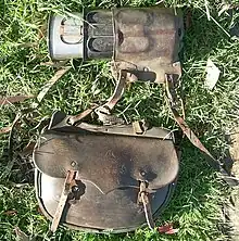 The traditional attire of a stockman or grazier is a felt Akubra hat; a double-flapped, two-pocket (for stock notebooks) cotton shirt; a plaited Kangaroo leather belt carrying a stockman's pocket knife in a pouch; light coloured, stockman cut, moleskin trousers with brown elastic side boots. The moleskin trousers have now largely been replaced by jeans. The plaited belt is often replaced by a working stockman or ringer with a belt known as a Queensland Utility Strap which can be used as a belt, neck strap, lunch-time hobble or a tie for a "micky".[5] This attire is still used in Australian Stock Horse competitions. Pocket knives may be used to castrate and/or earmark an animal, to bang cattle tails or in an emergency to cut free an animal entangled in a rope or horse tack.[6] Specially designed and cut for riding, oilskin Driza-Bone coats are used during wet weather. The horse typically wears a ringhead bridle, a saddle cloth, a leather Australian stock saddle, which may be equipped with a breastplate in steep country, and saddlebag and quart-pot.[3]