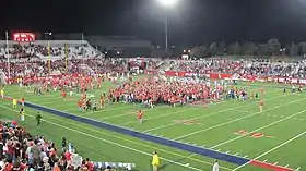 Stony Brook lost its first two games in 2011 to FBS teams, falling to UTEP 31–24 in overtime after allowing 21 unanswered points and being routed 35–7 by Buffalo.[37][38] The Seawolves fell to 0–3 by losing to Brown 21–20 in the home opener.[39] Then, Stony Brook began a program-record nine-game winning streak, beating Lafayette 37–20 in the conference opener and scoring at least 40 points in each game for the rest of the regular season. The Seawolves set the Big South single-game points record by crushing Gardner-Webb 76–28 and defeated Liberty 41–31 in the de facto Big South Championship Game to earn the conference's automatic bid to the FCS playoffs, Stony Brook's first.[40] In the first round of the 2011 FCS Playoffs, Stony Brook paired up against in-state rivals Albany, coming back from an 18-point deficit to defeat the Great Danes 31–28 in front of a then-record-setting crowd of 8,286, capped off by a game-sealing interception from safety Dominick Reyes.[41] In the second round, Stony Brook lost 34–27 to top-seeded Sam Houston State to end the season at 9–4 (6–0 Big South).[42]