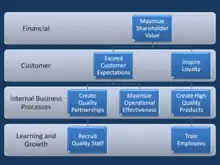 A strategy map is a diagram that documents the strategic goals being pursued by an organization or management team. It is an element of the documentation associated with the Balanced Scorecard, and in particular is characteristic of the second generation of Balanced Scorecard designs that first appeared during the mid-1990s. The first diagrams of this type appeared in the early 1990s, and the idea of using this type of diagram to help document Balanced Scorecard was discussed in a paper by Robert S. Kaplan and David P. Norton in 1996.[1]